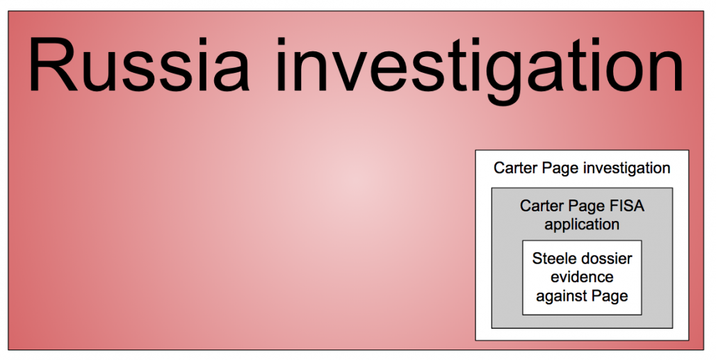 Thus the point of my graphic above. The Steele dossier evidence used in the Carter Page FISA application to support an investigation into Cater Page, no matter what else it says about the FISA application process or FBI candor, is just a small corner of the investigation into Trump’s people.