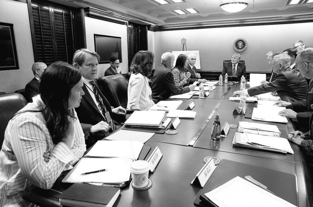 While she didn’t actually make the claim but implied it, the photo couldn’t have been taken “last night” (that is, Friday, just before the decision to bomb Syria), because Mike Pence was in Peru on Friday. My guess, given that Mike Pompeo is not in the frame, is it may have been taken on Thursday during the CIA Director’s confirmation hearing before the Senate Foreign Relations Committee.