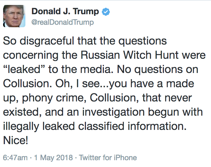 This morning, Trump predictably pointed to the list that one of his associates leaked, claiming to be outraged by a new “leak,” and asserted, evidence to the contrary, that the questions did not address “collusion.”