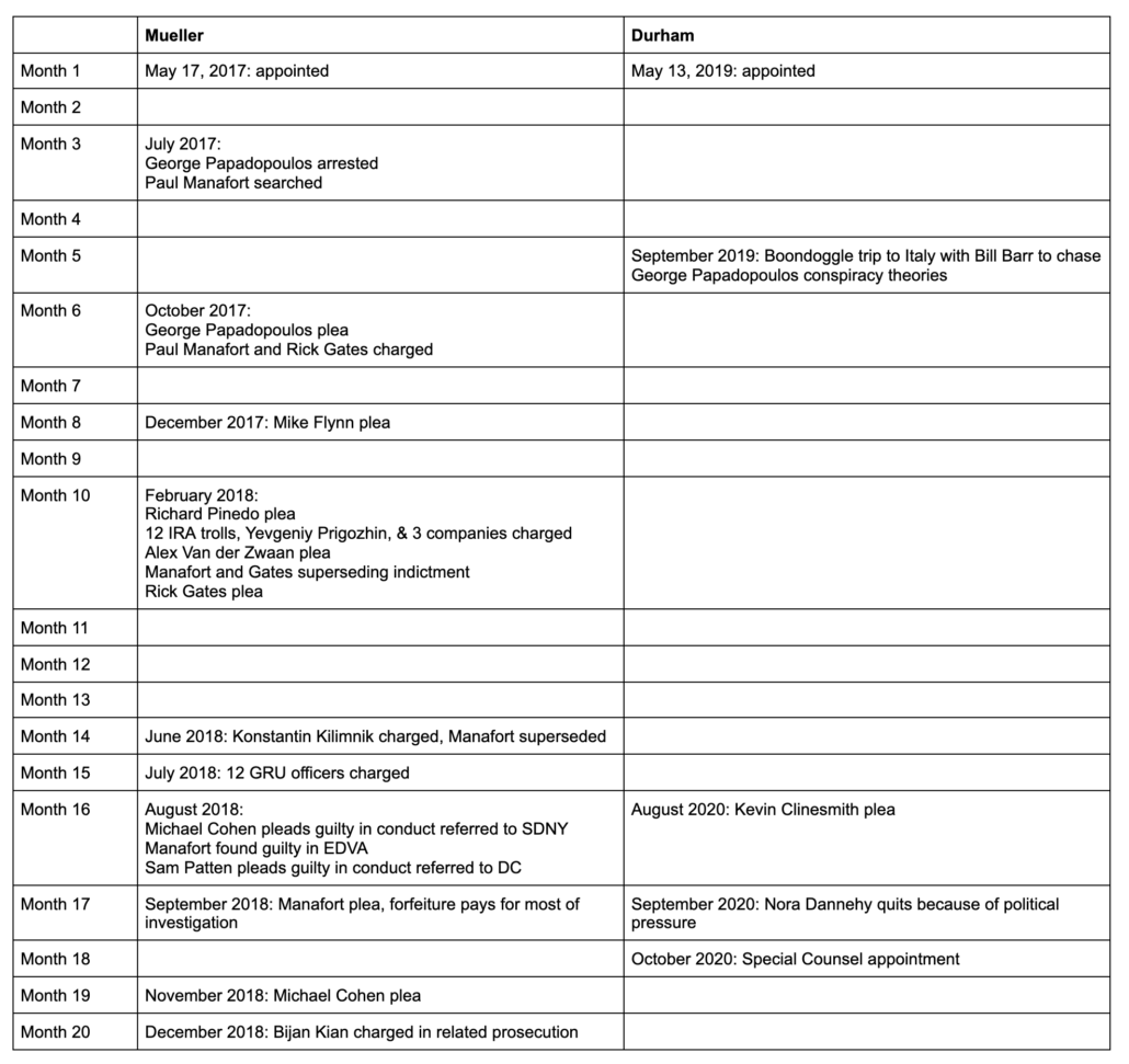 So I did a comparison of the Mueller and Durham investigations over their first 20 months. Here’s what that comparison looks like.