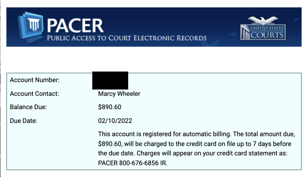 So I thought I’d bring receipts. I just got my quarterly bill for PACER, the shitty system via which one obtains court records for $.10 a page. Here’s what it looks like: