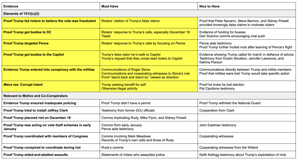 But there’s a more important thing that DOJ probably believed they needed before going after Trump and his close associates: compelling proof that Trump wielded the mob in his effort to obstruct the vote count, obtaining the proof in the yellow boxes, below. That was one of the things I was trying to lay out in this post.