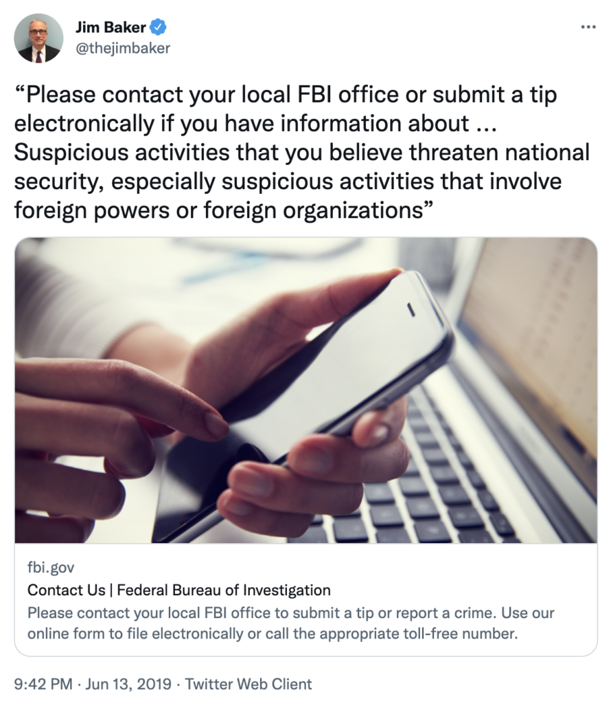With all that as background I want to point to something subtle that I suspect will become part of that theme. Ostensibly to address materiality — Baker’s belief, one he shared with Congress in 2018 but contradicted under coaching by Durham on the stand — that if you have a national security tip you need to feel free to come to the FBI. Baker tweeted it out on June 13, 2019.
