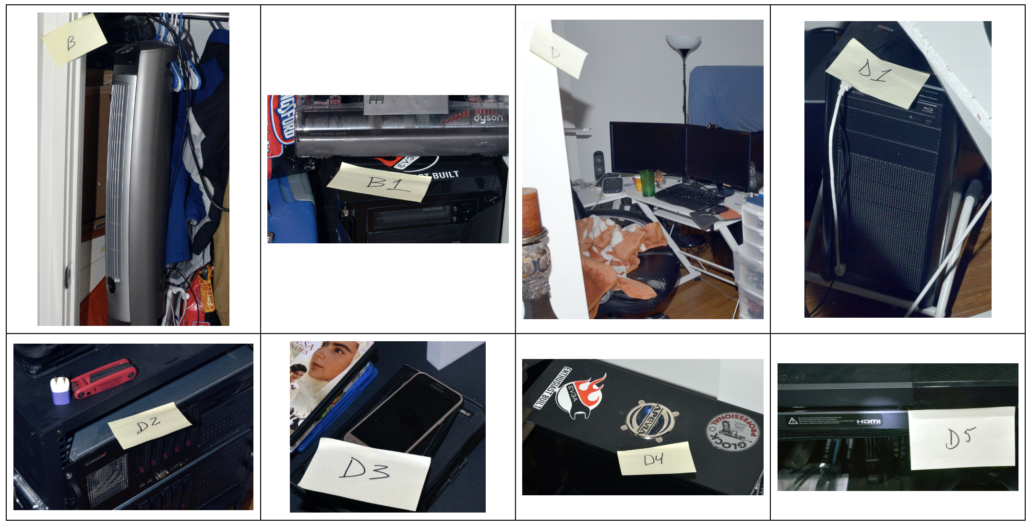In Schulte’s case, the FBI put a post-it bearing a letter A-G in the framing picture they took of every room in his apartment (I’ve shown B, the closet, and D, his living room), then used additional post-its to identify the items they would seize from those rooms. The pictures make it easy to show (for example) that the FBI took item B1, probably a server, from the closet where it had been stored next to the Kingsford Charcoal bag and under the vacuum cleaner.