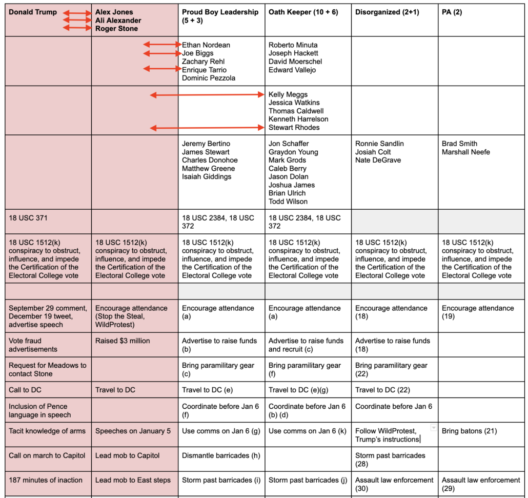 Obviously, the pink part of this table has not been charged (yet). And it may not be unless prosecutors win guilty verdicts in the Proud Boys case. It also may not be if the obstruction charge gets narrowed on appeal.