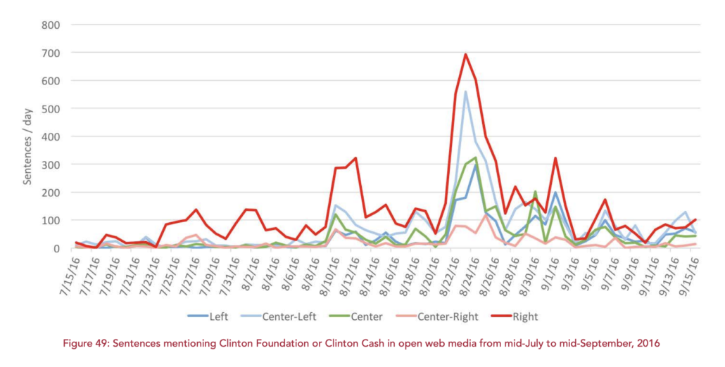 Worse still, Gerth’s claim is factually wrong. In precisely this period, the NYPost rolled out another Peter Schweitzer product, again crafted in close coordination with soon-to-be Trump campaign manager Steve Bannon, alleging improprieties pertaining to Russia, this time focused on John Podesta. The narrative had been in the works since March, even before the Russian hack of Hillary’s campaign manager. A 2017 Berkman Center report on the press and propaganda in the 2016 election showed that coverage of the topic spiked through much of August.