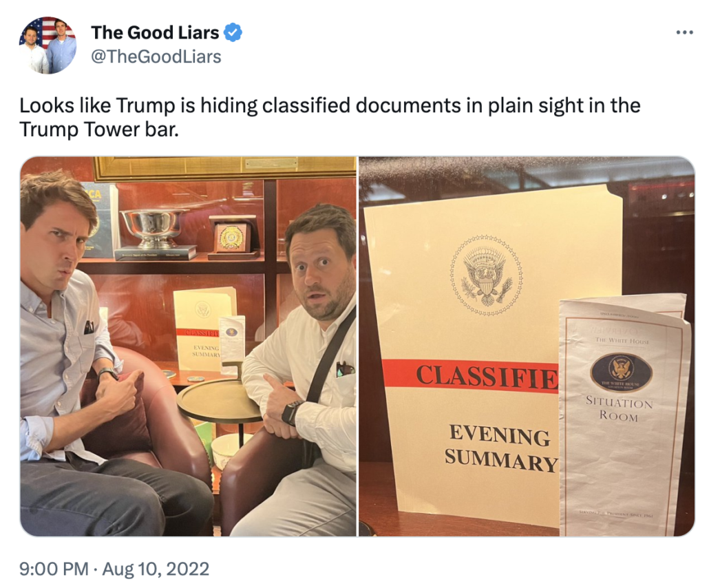We now know those stories were false, classic Trump limited hangout. Yesterday’s stories reveal that when Trump’s lawyers told journalists the search firm had only found two documents marked as classified in December, they were hiding the Trump calendars and the classified folder. They were lying to hide the stuff just revealed yesterday.