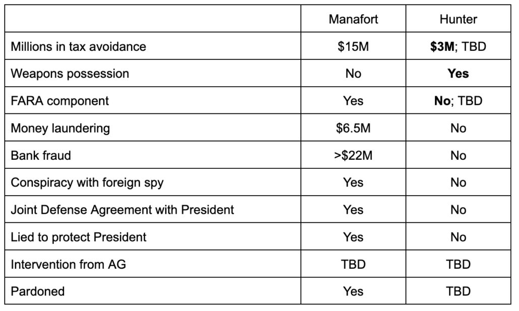 Note: I have not listed “lied to protect the president” for Hunter because, as far as I am aware, the President’s son has not made sworn statements to law enforcement — true or false — about matters affecting his father. Manafort did make false statements about matters implicating Trump during his breached cooperation with Robert Mueller’s prosecutors.