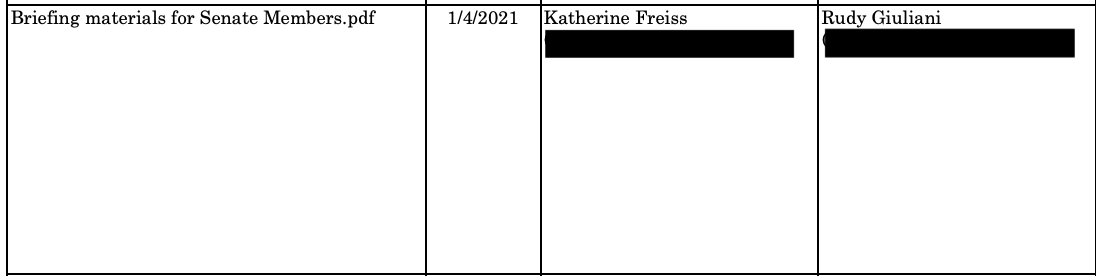 The same day as Freeman asked for sanctions, they also filed a motion to compel Bernie Kerik’s cooperation. They included a revised privilege log that — while they still argue it is noncompliant with legal standards — nevertheless points to a whole slew of interesting communications in Kerik’s possession. For example, there’s a January 4, 2021 briefing for members of the Senate on which Steve Bannon was CCed (note, Katherine Freiss used both protonmail and hushmail to conduct her coup plotting; I’m leaving these emails unredacted to show the stealth with which these people were trying to steal an election).