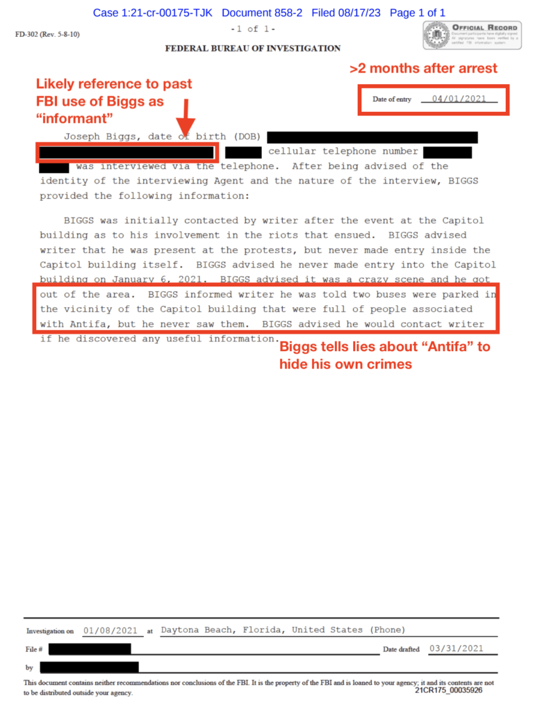 In fact, as Biggs further described it back in March 2021, long after he had become a key figure staging violent confrontations, five months before leading an attack on the peaceful transfer of power, an FBI Agent in Daytona Beach recruited Biggs to be an informant targeting Antifa.