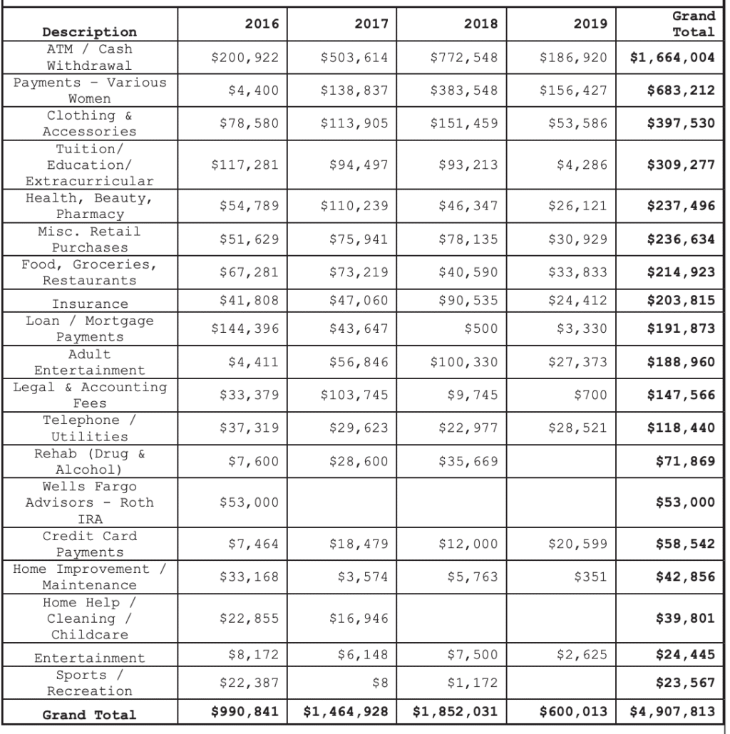 This is, in my opinion, a necessary but also the weakest part of the indictment. The table Weiss includes showing where Hunter blew his money shows his expenses dropped already in 2019 (during just half of which year he was sober), and it doesn’t include 2020 at all.