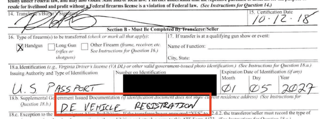 Palimere decided to write Delaware registration in the box labeled 18.b. Palimere does not know why that was chosen but he knew it had to be an official document and it was all they could think of. Turner was the one who wrote Delaware vehicle registration in the box. Palimere thinks that if Biden presented a vehicle registration on the day of the sale, it would have been documented on the certified 4473.