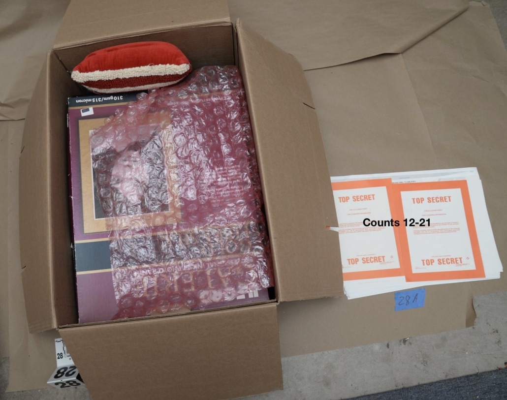 And fully ten of the documents charged were found under some bubble wrap and a Christmas pillow in this box, which would have been found in the storage room, perhaps on the opposing wall to the picture above.
