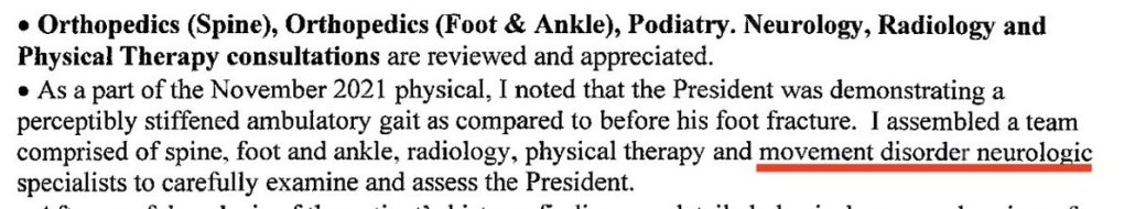 That means they had all the tools they needed, aside from some basic reading comprehension, I guess, to discover that elsewhere in the same report they linked, under the heading that included “neurology,” O’Connor described adding a movement disorder neurologic specialist — someone just like Dr. Cannard!!! — to advise him on Biden’s gait problems.