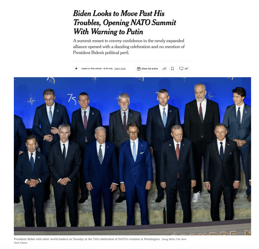 Predictably, the NYT treated President Biden’s speech to kick off NATO’s 75th Anniversary as if Biden merely invented the date and the event and maybe even NATO itself to cover up a shoddy debate performance. In addition to the subhead that nonsensically complained there was, “no mention of President Biden’s political peril,” in his speech, in this 25-paragraph story, NYT made this a story about Biden’s campaign by: