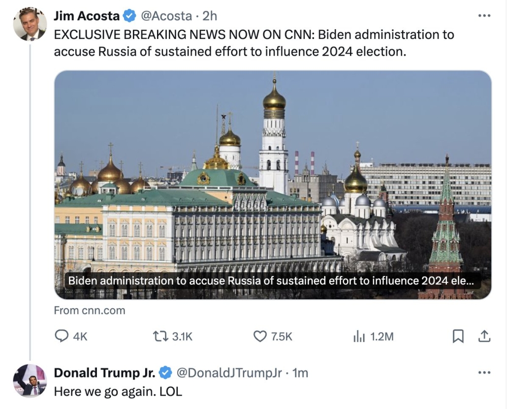 When DOJ announced today it would unseal legal actions against Russian influence operations, the former President’s failson complained, “Here we go again. LOL”