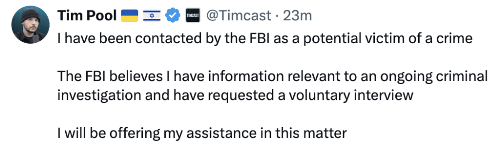Indeed, last week, Tim Pool (believed to be Commentator-2 in the RT indictment) revealed that he would assist in the investigation (presumably meaning he’ll sit for the interview the FBI requested).