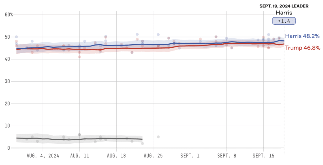 My suspicion is we’re still seeing two effects: that of RFK endorsing Trump, which may have helped Trump by a point (indeed, some polls aren’t including him in states, like WI and MI, where he remains on the ballot) and the debate and Taylor Swift endorsement, which may have helped Harris by up to three.