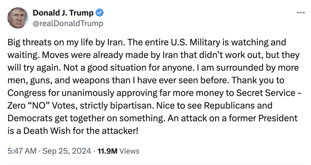 In the wake of Routh’s indictment yesterday, the IC briefed Trump on ongoing assassination threats from Iran. And while his comments to Fox — suggesting that Kamala Harris was weak on Iran — were typical Trump garbage, Trump’s Xitter account posted something that — for him — is downright gracious, recognizing the bipartisan support to expand Secret Service funding.