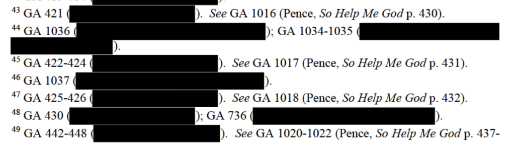 Another thing prosecutors did is engage in a system of parallel citation, often citing what must be interview or grand jury transcripts along with passages from Pence’s book.