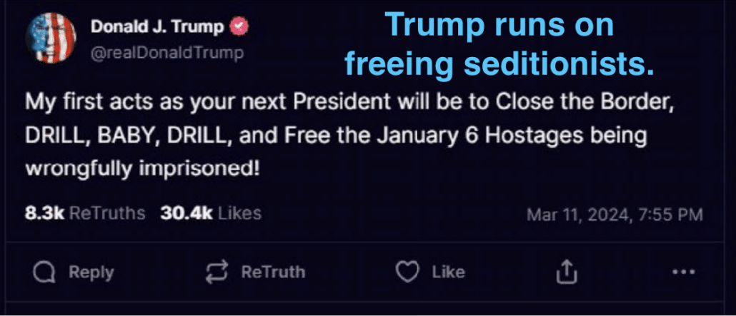 As the appendix documents, on March 11, 2024, Trump posted to Truth Social that, along with closing the border and DRILL, BABY, DRILL, his first priority, Day One, was to free the seditionists and cop assailants who had fought for him on January 6.