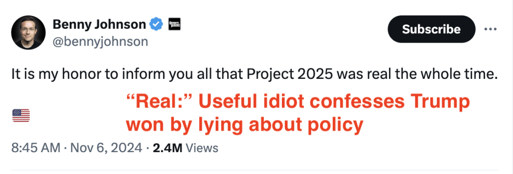 In the other, propaganda worked far better. Trump didn’t even hide that he was running on propaganda. JD Vance said it plainly during his debate: their campaign wasn’t willing to participate in any venue that would fact check. They did not contest this election on true claims about policy. Indeed, hours after Trump’s win became clear, one after another influencer announced that, yes, Donald Trump really does plan on implementing Project 2025, even though he falsely disavowed it as a core tenet of his campaign over and over.
