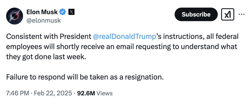Simply put, OPM sent an email using HR@opm.gov demanding that all employees reply to the email with a list of things they did last week by 11:59 PM on 24 February, and today President Trump stated that if someone does not reply “[they’re] sort of semi-fired or [they’re] fired.” Elon Musk (@elonmusk), X.com (Feb. 24, 2025 1:25 PM), at https://x.com/elonmusk/status/1894091228054261781 (last accessed Feb. 24, 2025).