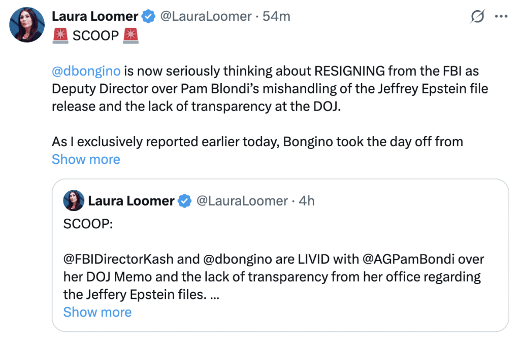 Conspiracy theorist Laura Loomer is at the pivot of both worlds, and she’s playing her part to perfection. She started things today by revealing that Dan Bongino — who actually doesn’t like how hard he has to work at FBI anyway — complaining about how the memo that attempted but failed to tamp all this down happened.