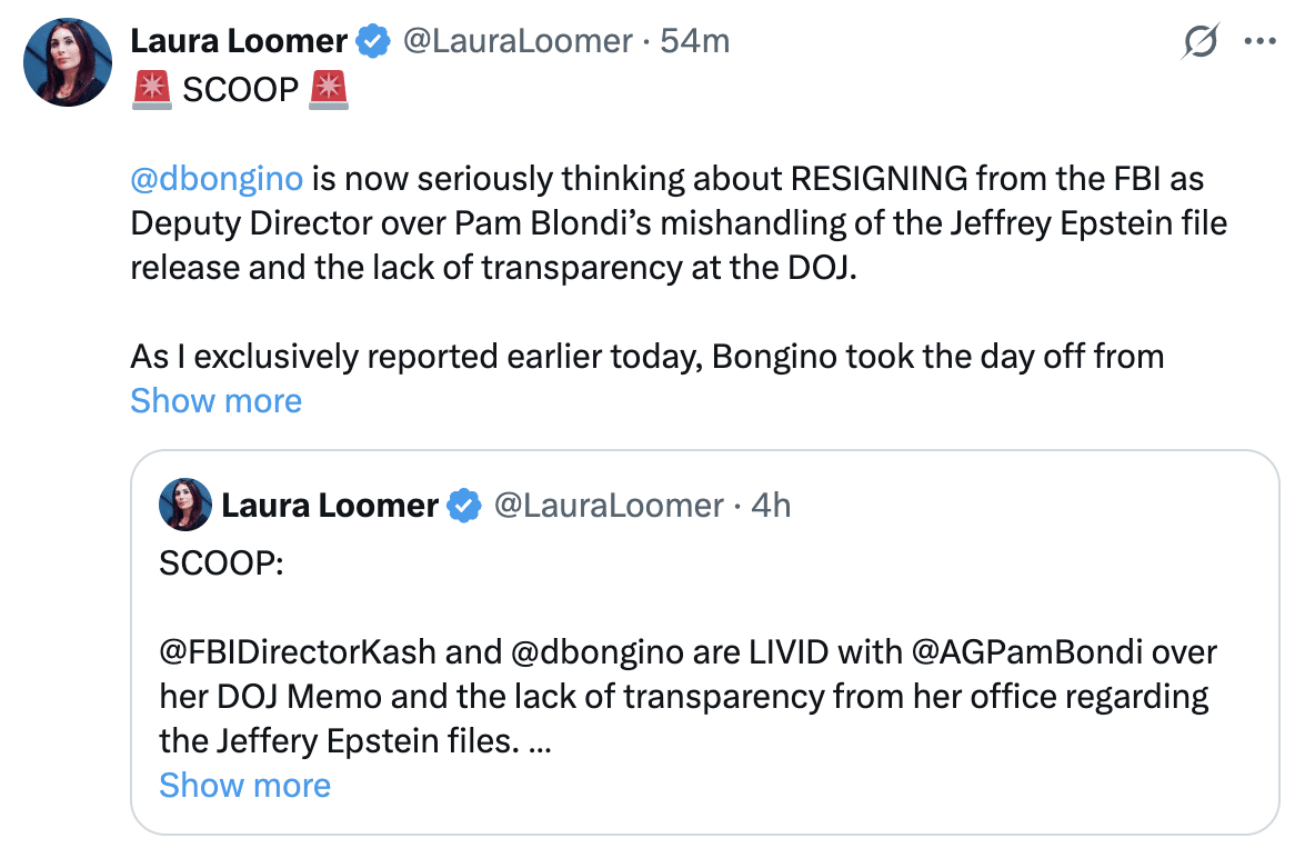 The intrigue: MAGA influencer Laura Loomer, a Bondi critic, first reported Friday on X that Bongino left work and that he and Patel were “furious” with the way Bondi had handled the case.