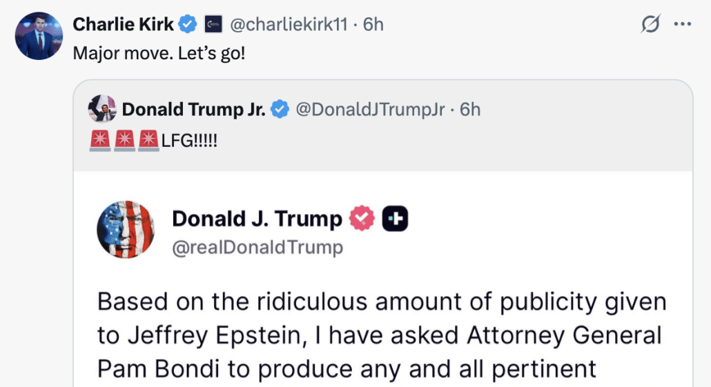 Charlie Kirk and the President’s failson are very impressed with President Trump’s order that Pam Bondi seek to release grand jury transcripts.