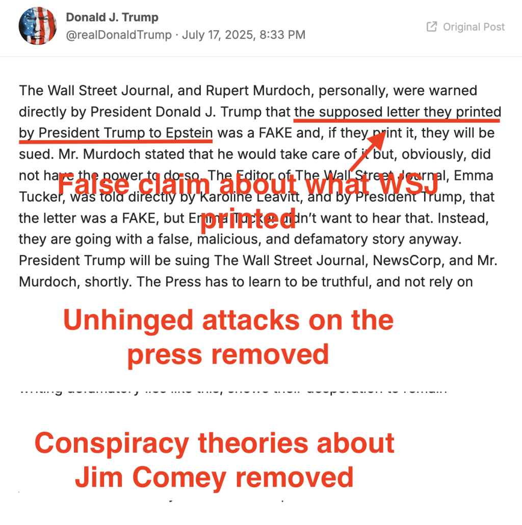 But the only proof that Trump presents that he did speak with Murdoch is an unvalidated screen cap of Trump’s Truth Social post posted after the fact to that effect (when Hunter Biden tried to submit such things in a court filing, DOJ successfully rejected it).
