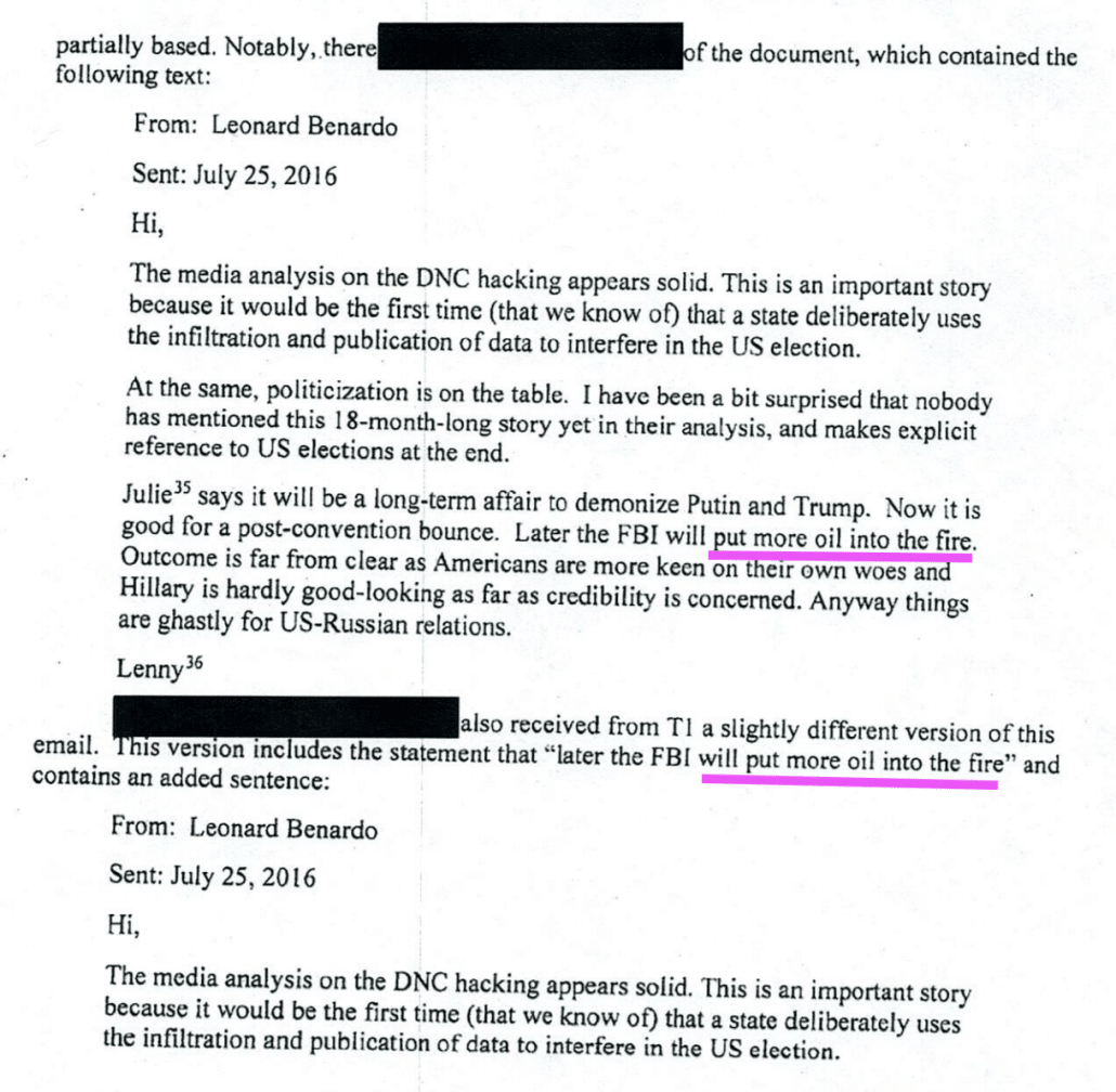 Durham describes that, in a May 21, 2021 interview with Leonard Benardo, Durham showed the Open Society Foundation Executive an email purportedly stolen from him in 2016 and asked him if he wrote it. Benardo told Durham, “he would not have used certain terms, such as ‘oil into the fire.'”
