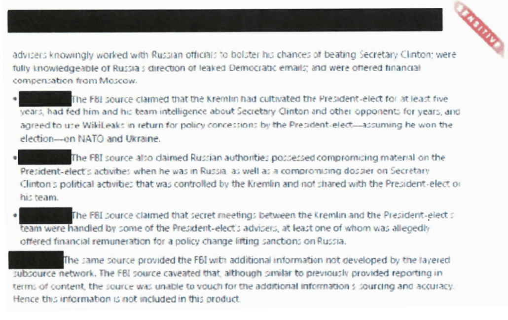 There are several things in the ICA annex — as opposed to the dossier — that right wingers misrepresent. As I noted, the GOP neglected to mention the caveat in the first paragraph, noting that the dossier was “highly politically sensitive information” for which US spooks had “only limited corroboration” and so “did not use it to reach the analytic conclusions of the CIA/FBI/NSA assessment.” It turns out the 2-page annex is barely a page-and-a-half (which means between HPSCI and I we’ve written far more about this document than exists in the document itself). HPSCI might rightly complain that the appendix didn’t describe that Steele had been closed for cause, but they misrepresent several other parts of their complaint, notably that Steele “collected this information on behalf of private clients and was not compensated for it by the FBI” and that “multiple Western press organizations” started printing it (they got the date wrong but to get to the larger scope of Steele’s press blitz, HPSCI did over a year of persistent investigation). The GOP complained that this section had classification markers, but the most substantive ones come in the 3-bullet section that compares the dossier content to existing intelligence (and besides, when the ICA was published on January 5, 2017, Steele’s identity was not yet publicly confirmed).