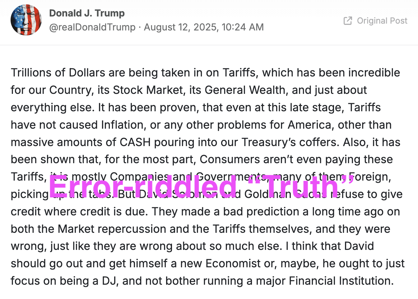 Yesterday, he lied that “consumers aren’t even paying these tariffs” (they’re paying about a fifth of them), then lashed out at a Goldman economist who said that would soon change.