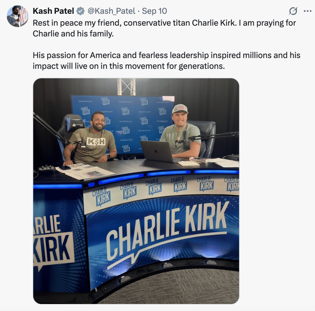 And all that’s before you consider how Kash Patel has done much to make any bid for the death penalty unsustainable (to say nothing about Federal charges against Westman), given his repeated evocations of love for Kirk, down to promising he would see him in Valhalla (wittingly or unwittingly repeating the words of the far right Christchurch killer).