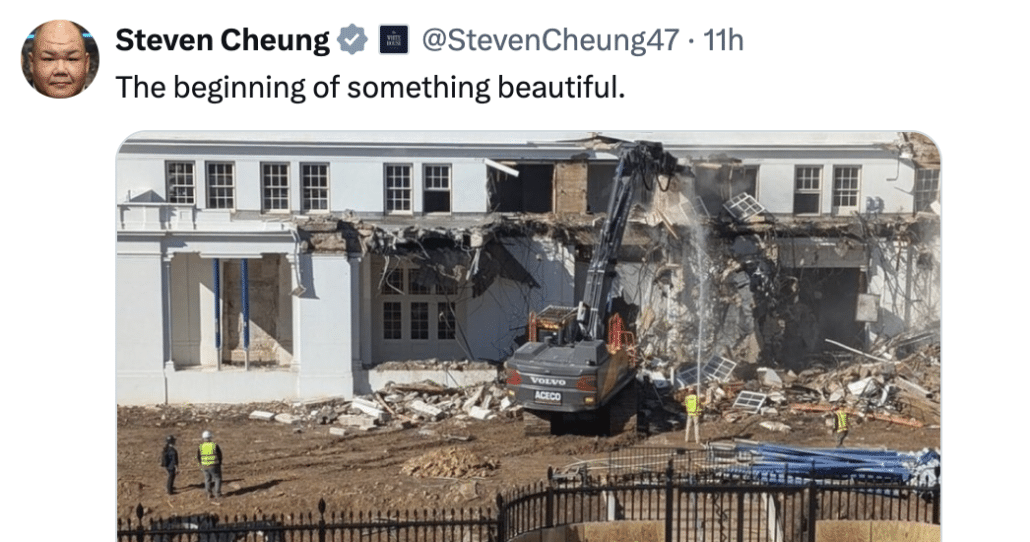In a nice touch, the folks in Treasury who’ve implemented Bessent’s bailout of his hedgie buddies have been instructed not to take and disseminate pictures of the wreck Trump has made of the East Wing.