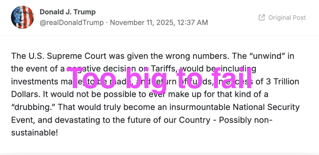 But if SCOTUS rules Trump has to pay the money back, to everyone, it will create the kind of fiscal challenge that could turn his current political woes into a crisis, not least because right wing members of Congress have been treating this tariff revenue as “free” money they could point to to pretend they were addressing the deficit.