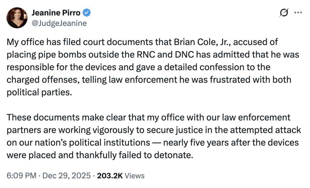 But Jeanine Pirro did. She want on social media and repeated the apparent miscitation of Cole’s own words I laid out here, treating a comment made in the present tense this month — “I really don’t like either party at this point” — as if it were a comment about his mindset on January 5, 2021.