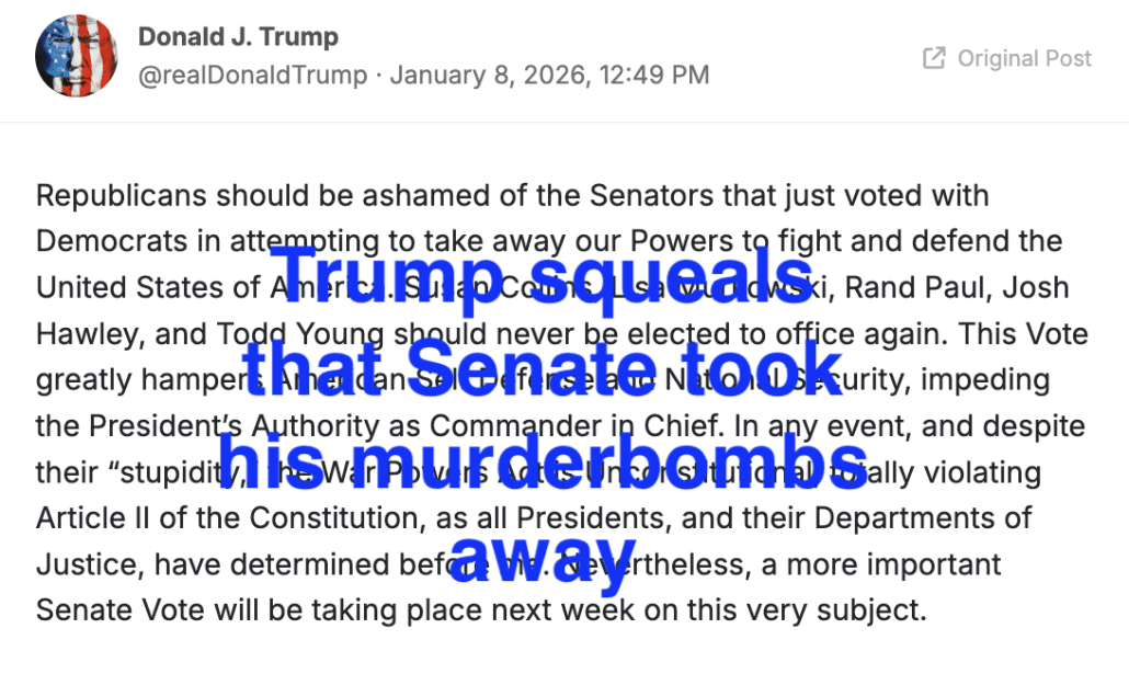 And that was yesterday. That same day, the Senate passed Tim Kaine’s War Powers Resolution prohibiting Trump from invading further without approval from Congress, with Todd Young, Lisa Murkowski, Susan Collins, Rand Paul, and Josh Hawley’s support.