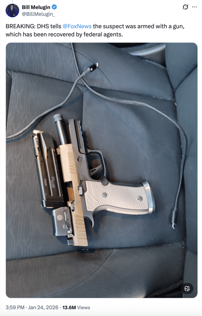 During this same time period, a counter frame began to emerge — with the help of a Fox News journalist. Shortly after 10am CST, Bill Melugin reported via X that the victim, which he referred to as the “suspect,” had been armed. His post was sourced to DHS (the Department of Homeland Security) and contained an image of gun. This new information, which could be easily fit into a counter frame, set off a flurry of activity on the right.