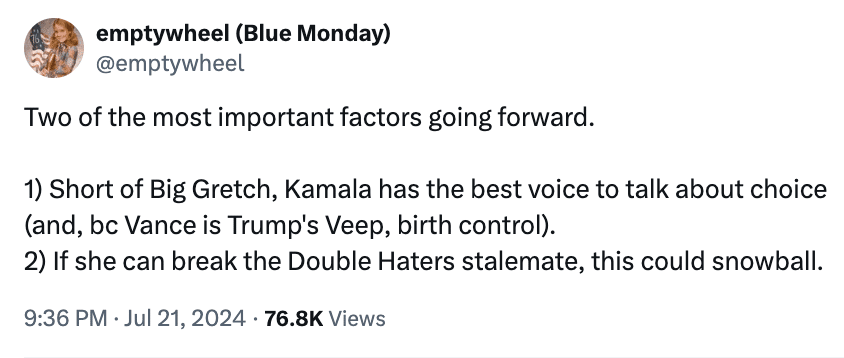 Mahomes’ vote — presumably cast in MO, where the couple lives — is not going to swing any races. But what is publicly reported to be going on with her may go on with millions of the diehard Swifties who would normally be soft Trump supporters. But that process takes time. First they reconsider their prior beliefs, then they learn why Swift supports Harris, then they get used to the idea of voting for a Democrat.