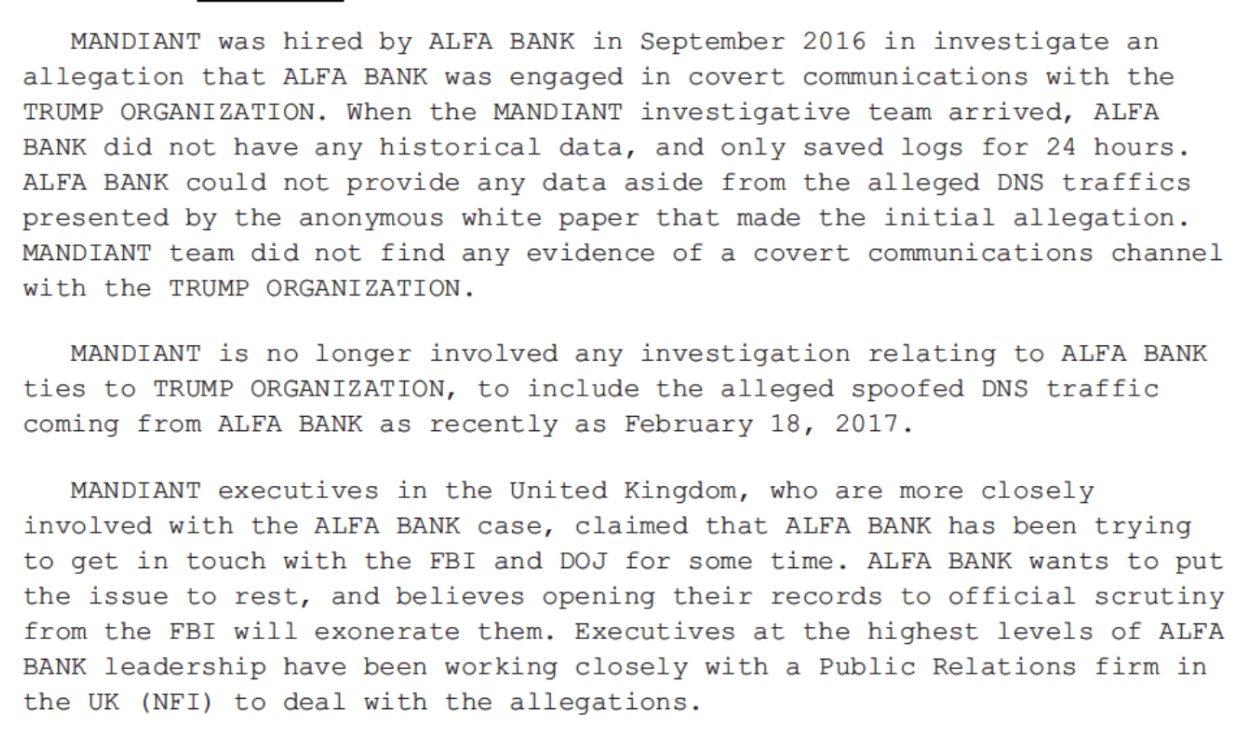 Q. And were you aware, while you were doing the investigation, that Mandiant, when it went to talk to AlfaBank to look into these allegations, did not have any historical data, that Alfa-Bank did not provide any historical data to Mandiant? Did you know that?