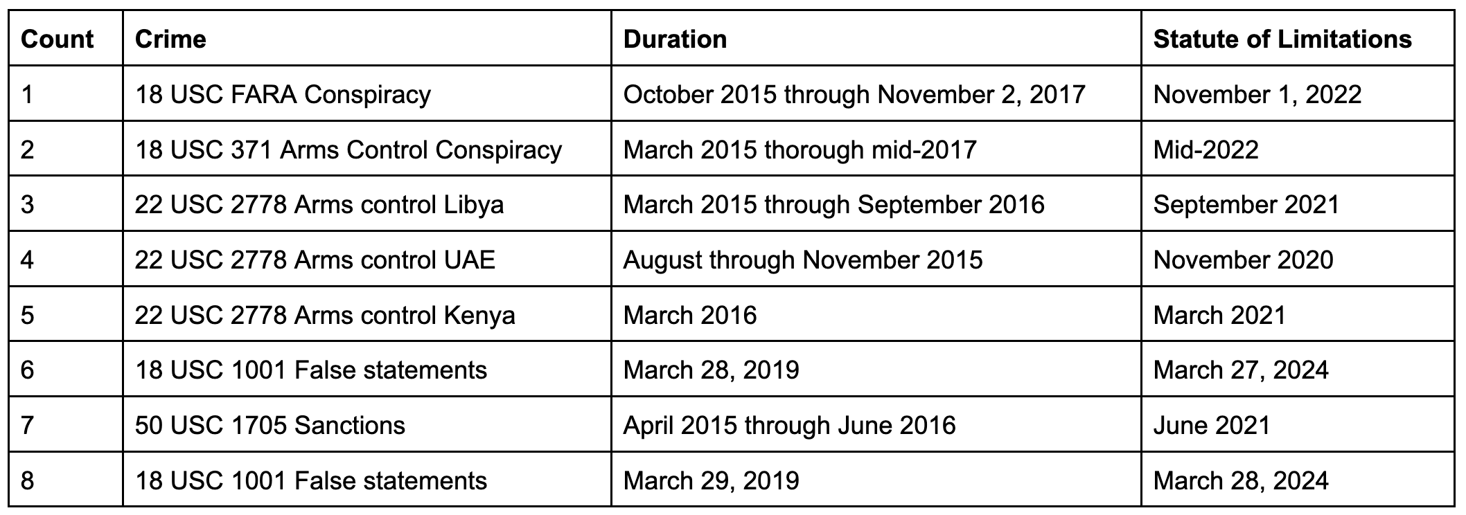 Here’s what the charges, duration, and five year Statute of Limitation looks like for the indictment against Luft.