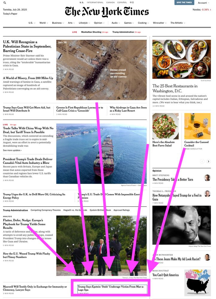 Many, for example are forgetting what Trump said the day before: Epstein “stole” one of Trump’s girls, Trump told him to stop, and Epstein did it again.