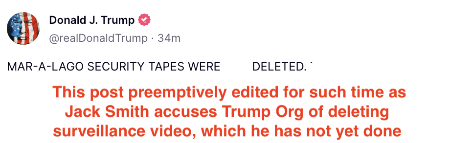 It is true that the current indictment does not yet charge Trump and his corporate person with deleting video. It is also true that the indictment stops at 3:55PM on June 27, 2022, more than a week before some surveillance footage was turned over on July 6, 2022. We only know part of what happened during the first five days after Trump Org was alerted to the subpoena. That leaves a lot of time for shenanigans.