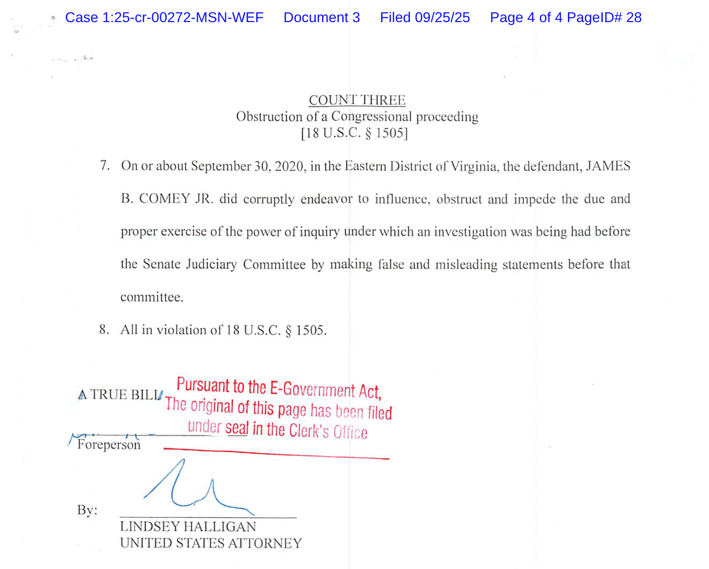 2. On September 25, 2025, I presented the case of the United States v. James B. Comey, Jr., to a federal grand jury in the Eastern District of Virginia, Alexandria Division. I have reviewed the full transcript of the grand jury proceedings, and the transcript accurately reflects the entirety of the government’s presentation and presence in front of the grand jury. There was no additional presentation, interaction, or discussion with the grand jury outside of what is reflected in the transcript. Below is a brief timeline of the events that day.