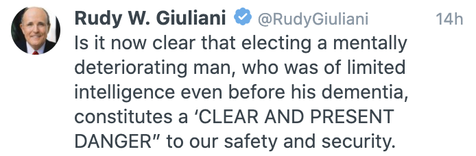 And his former attorney, wailing on Twitter about the ‘CLEAR AND PRESENT DANGER” posed by “mentally deteriorating [men], who [were] of limited intelligence even before [] dementia” remains under criminal investigation as an unregistered agent of Russian-backed Ukrainians for his role in politicizing Ukraine.