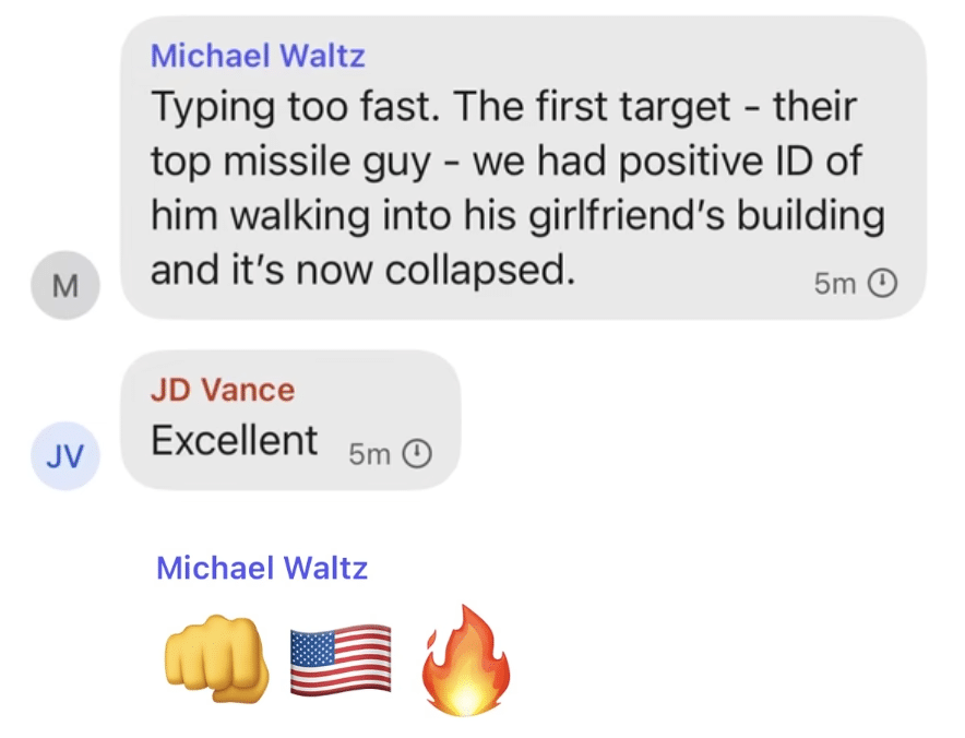 Eleven minutes after Mike Waltz kicks off the thread with instructions that Joint Staff is sending “a more specific sequence of events in the coming days,” JD Vance piped in to say he thought the strikes were a mistake.