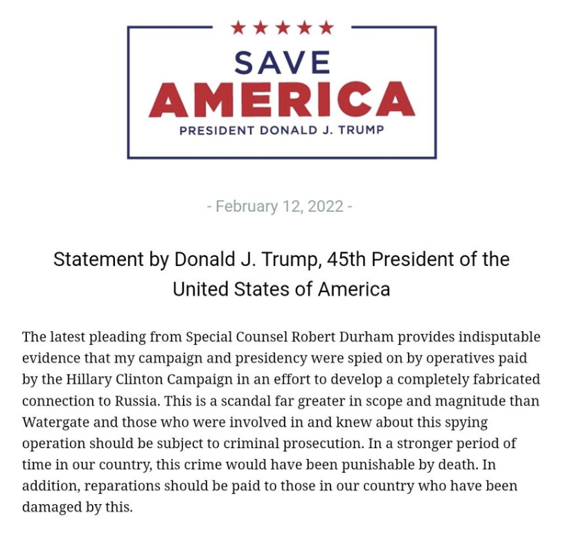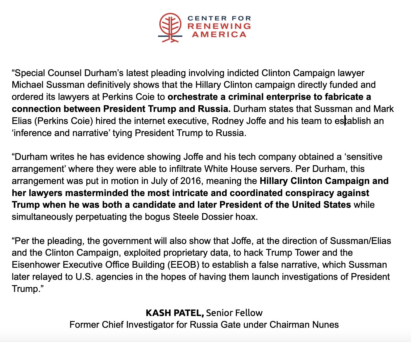 The quote seemed to confirm the conspiracy theory that Durham had otherwise failed to substantiate, that Hillary had a plan to frame Donald Trump.
