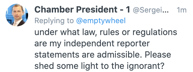 On the Danchenko prosecution, Durham insanely initially relied solely on Sergei Millian’s Tweets to substantiate the four charges associated with Millian. He did so without first interviewing George Papadopoulos, whom Millian seemed to be cultivating in precisely the period when Durham’s conspiracy theory was born and for months thereafter. As soon as I noted how problematic that was, Millian started getting squirrely.